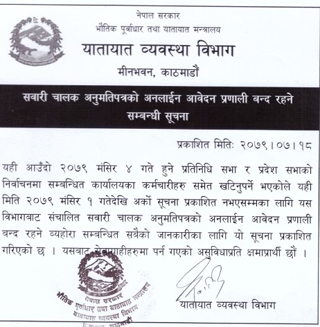 एक सूचना जारी गर्दै यातायात व्यवस्था विभागले लाइसेन्सको अनलाइन आवेदन प्रणाली अनिश्चितकालका लागि बन्द हुने बताएको छ । सूचना अनुसार अर्को सूचना प्रकाशित नभएसम्मका लागि यो प्रणाली बन्द हुनेछ ।